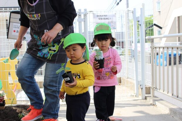 今年はミニトマト・オクラ・キュウリ・ピーマン・いんげん・じゃがいもを1、2歳児の子どもたちで植えました。