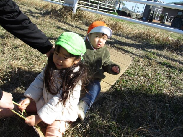 お散歩に段ボールのソリを持参して、草の土手を滑って遊びました。