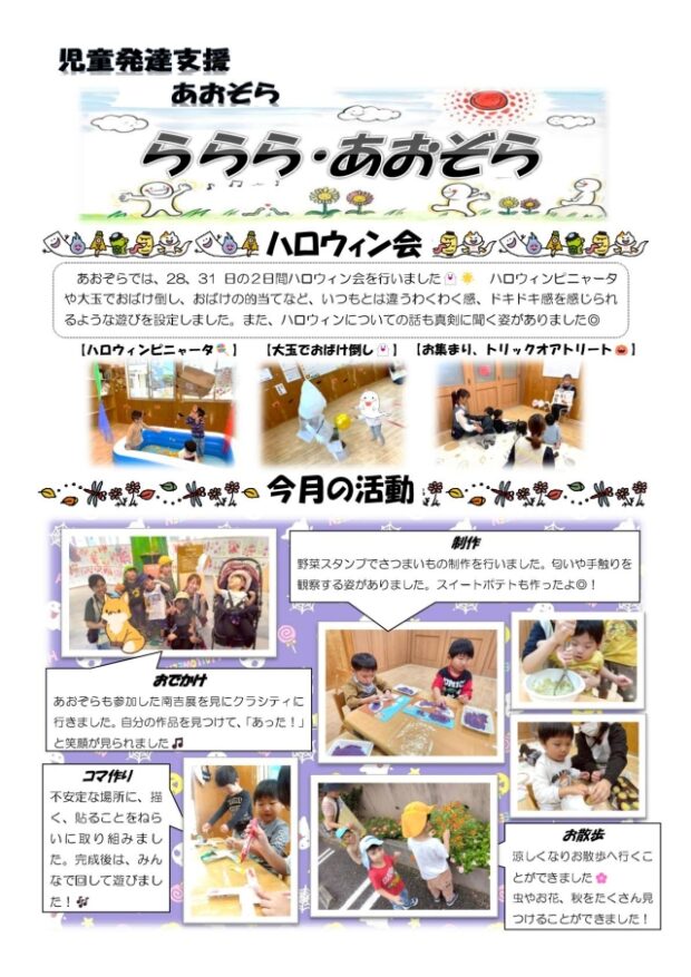 ますます深まる秋を感じながら、自然とのふれあいを楽しんでいる子どもたち。10月、あおぞら児発では、ハロウィン会やおやつ作りを行いました。始めてのことにも、先生の話を聞いて楽しそうに取り組む姿がたくさん見られました!