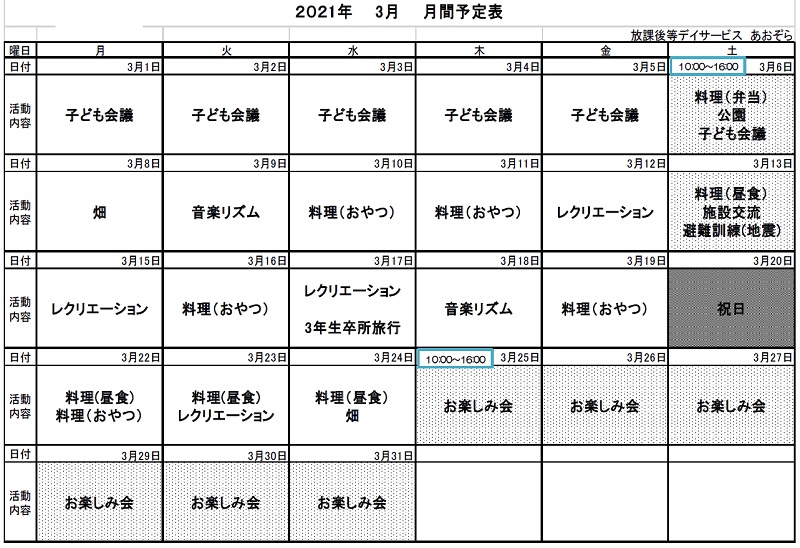 3月の児童発達支援と放課後等デイサービスの活動は、以下のように予定しております。