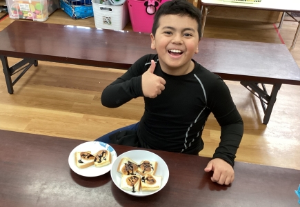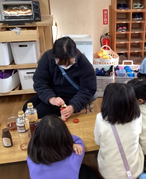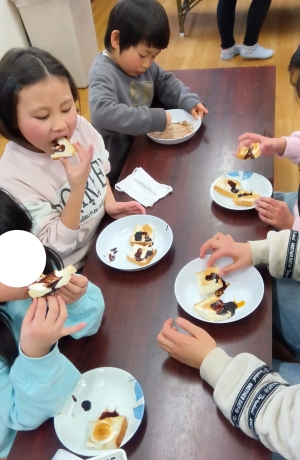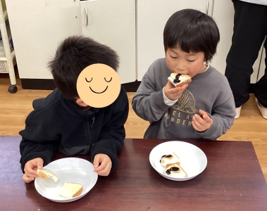 スモアでは、食べる直前にトースターでマシュマロを乗せたパンを焼いて、温かい状態で提供しました。好みのソースをかけて、嬉しそうに食べる姿がたくさん見られました♪