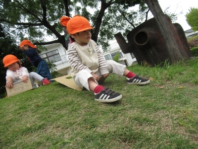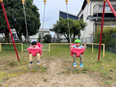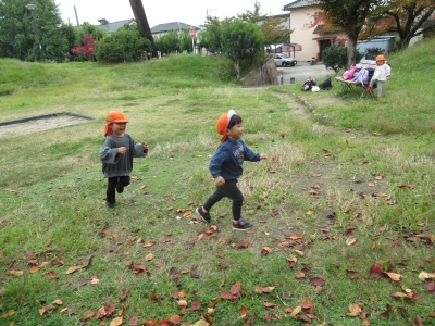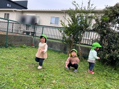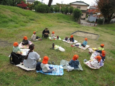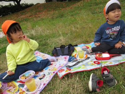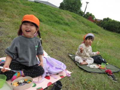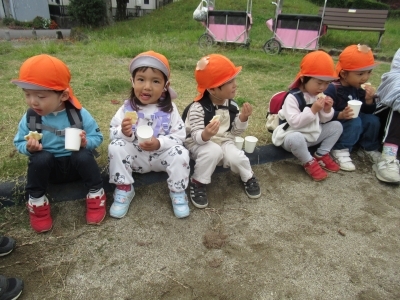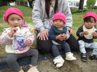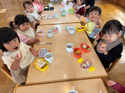 クラスごとに行き先を決めて1歳児さんはちびっこ広場、0・2歳児さんは大伝根公園へ出掛けました。遠足気分が味わえるよう全クラスおやつを持って出発!(2歳児さんはリュックにお弁当を入れて背負って行きました)この日を楽しみにしていた子ども達の足取りは軽く、それぞれ目的地に着いてまずはおやつタイム♪お友達と顔を見合わせながらおせんべいをパリパリ♪その後は元気に走り出し思う存分遊ぶ子ども達でした!1歳児さんは園に帰ってお弁当を食べ、2歳児さんは公園でピクニックシートを敷いてお弁当タイム♪(実は2歳児さん、公園に着いて数分後には「お腹空いた」「お弁当食べたい」と言っていて楽しみで仕方がない様子でした)愛情たっぷりのお弁当に笑顔が溢れ、嬉しそうに食べる子ども達でした。