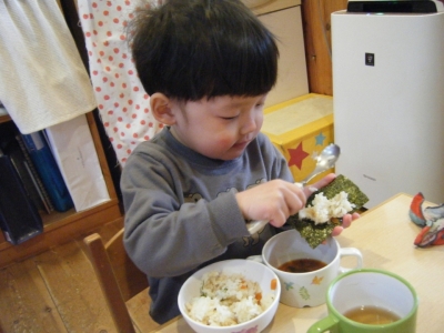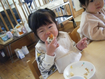 お昼は手巻き寿司。海苔を片手に器用に手巻き寿司を作ってパクリ♪おやつは“鬼ぎり(おにぎり)”お皿にのった鬼の顔をしたおにぎりをじーっと見つめたり、角に見立てた人参を取ってみたりしながらもガブリ!と食べる子ども達でした。
