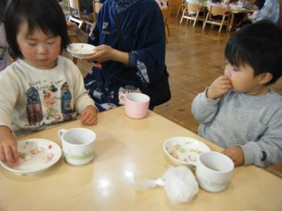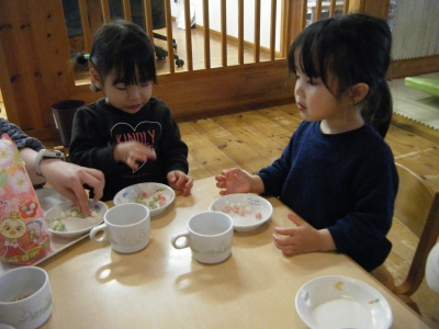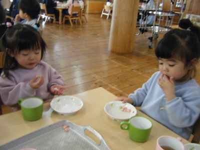 ひなまつり会では由来を聞いたり、歌をうたったりしてひなまつりの雰囲気を味わいました。さらに“おたのしみ券”を発行してひなあられと交換!“おたのしみ券”が配られると子ども達は大事に持って席へ移動し、ひなあられと交換してもらい楽しい会になりました。