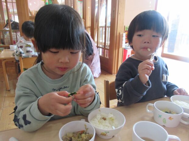 お皿の中から小松菜を探して「これが小松菜だよ」と教えてくれる子や「(食べるから)見ていてね!」と大きなお口でパクリ!と食べる子など、最後の収穫野菜をそれぞれに楽しんでいましたよ。