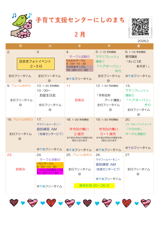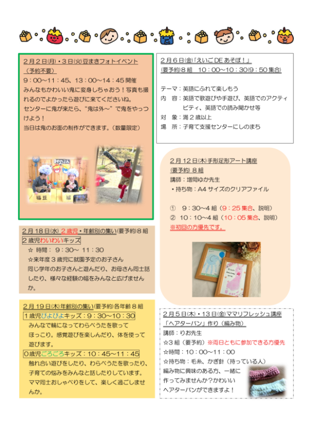 2 月のお便りです。2 月は上旬に「豆まきフォトイベント」があります。ぜひ遊びに来て下さいね!