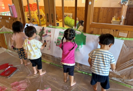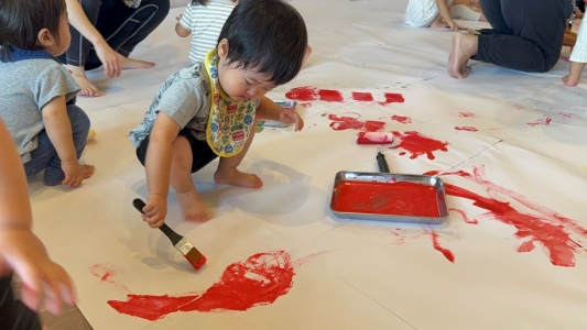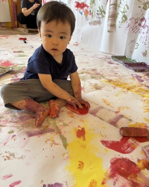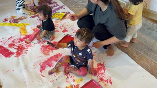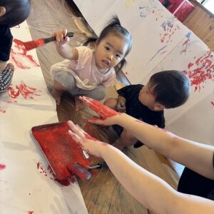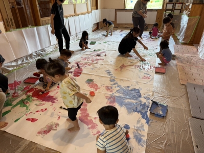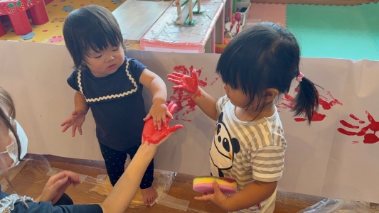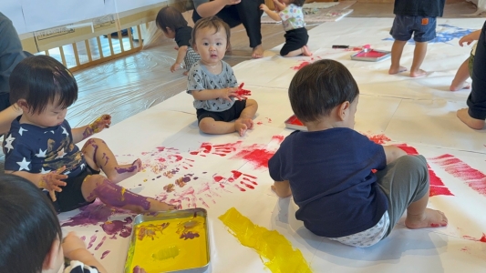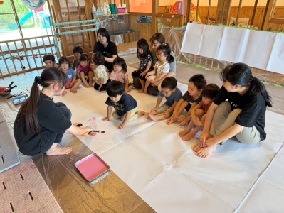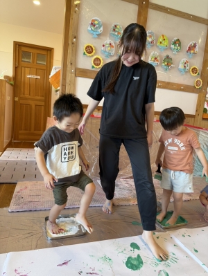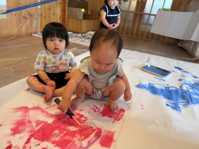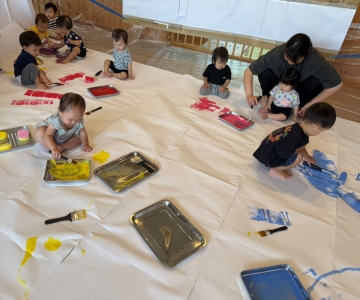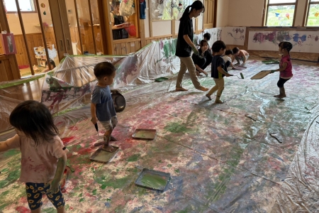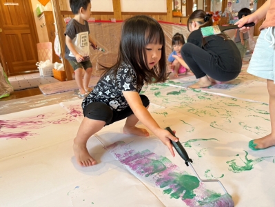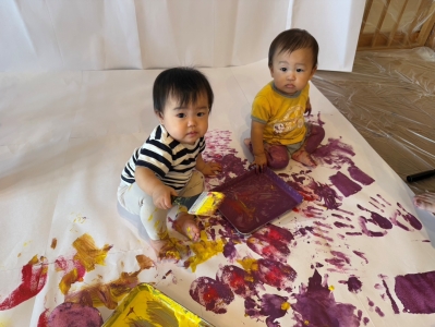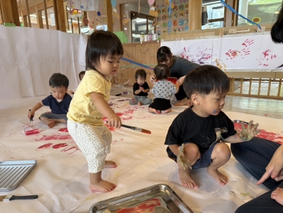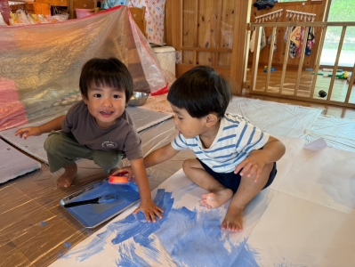 今年もボディペインティングを楽しみました!とっても大きな画用紙に、はしゃぐ子どもたち♪みんな好きなように、思い切り絵の具をつけて楽しんでいました。手や足に絵の具をつけて“ペタペタ”と感触を楽しむ子や、筆やはけ、コロコロを使って、画用紙いっぱいに描く子、お友だちと笑い合いながら一緒にやる子など、それぞれ楽しむ姿がありましたよ♪うさぎ組のお友だちは、ぺたぺたつけた手形を見て「はなび~」と教えてくれたり、ペンキ塗り職人みたいな真剣な表情で塗ったりする姿がとっても可愛かったです!