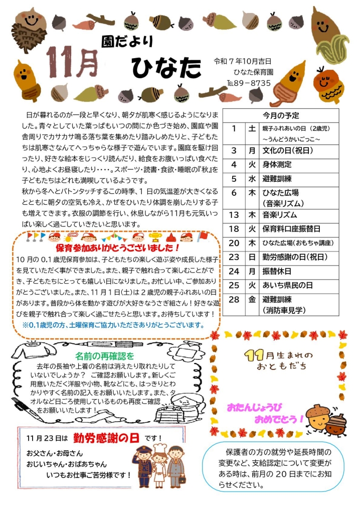 11月のひなた広場は、6日と20日の木曜日、9:30~11:00です。