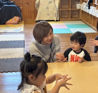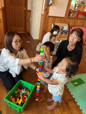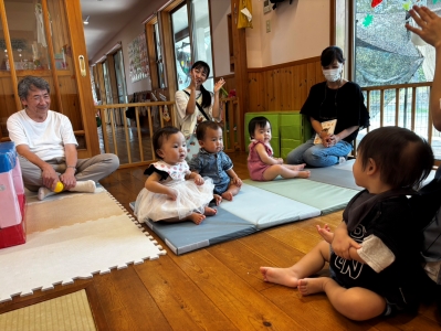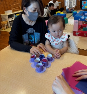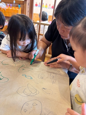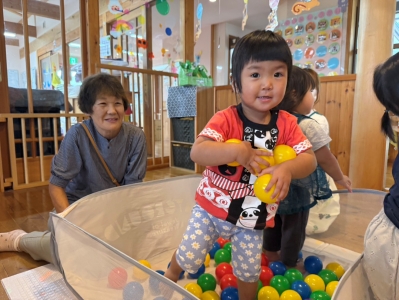 音楽リズムやお絵描き、ボールプールなど、いろんな遊びを楽しみました。おじいちゃん、おばあちゃんたちと一緒に製作もしましたよ!完成したら、「どうぞ~」とプレゼント♪ちょっぴり照れて、恥ずかしそうに渡している姿がかわいかったです。