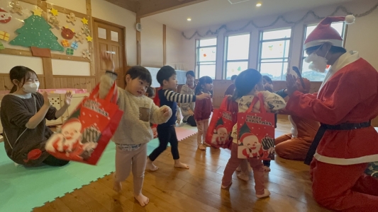 みんなでクリスマスツリーを飾っていると、”りんりんりん~“と鈴の音が!!サンタさんがやってきて、プレゼントをもらいとっても嬉しそうにしていました。