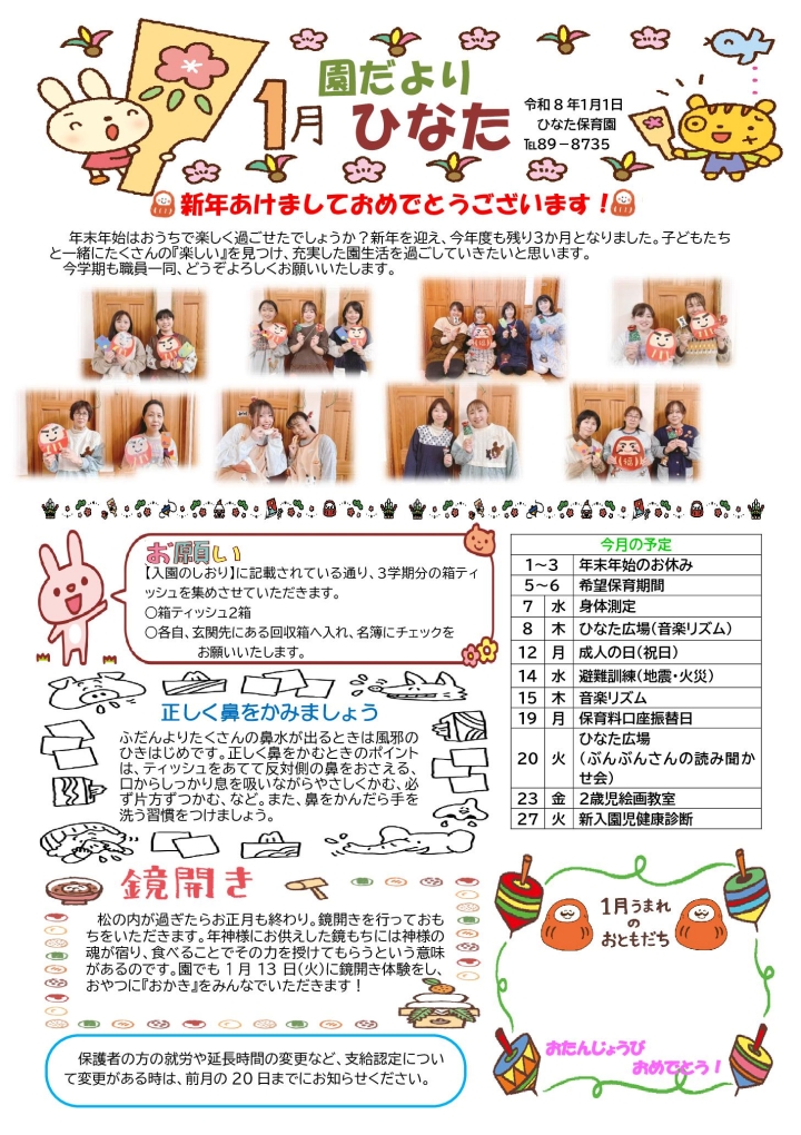 1月のひなた広場は8日(木)と20日(火)の9:30~11:00です。
