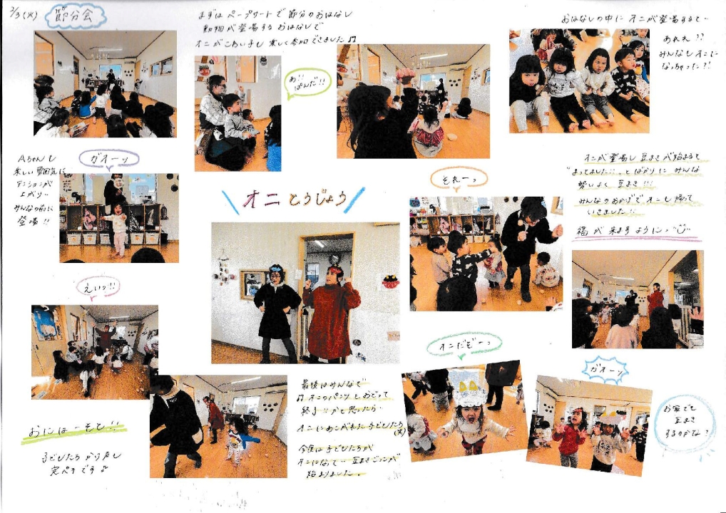 1月に入ったころから、保育園では「鬼のパンツ」が大流行!何度も絵本をめくりながら歌を歌ったり、曲に合わせて踊ったり・・・。鬼退治の準備は万端!2月3日の節分会では、ペープサートを楽しんだり、👹かわいい?!鬼の登場に、みんなキョトンとしながらも、豆を拾っては投げを繰り返し、無事に鬼を退治することができました。節分会が終わっても「鬼のパンツ」ブームはしばらく続く気配を見せています(笑)