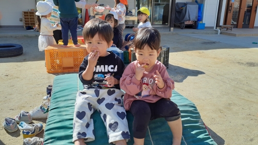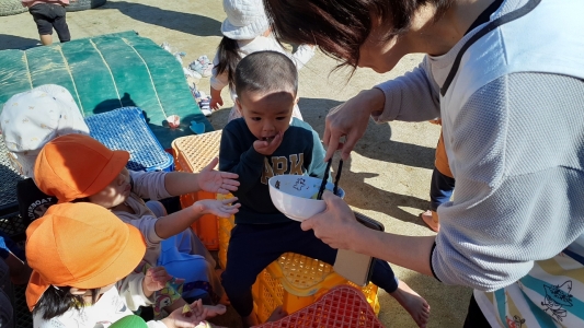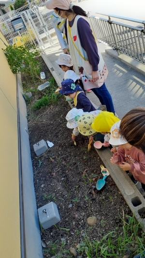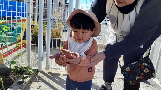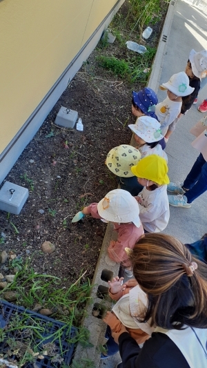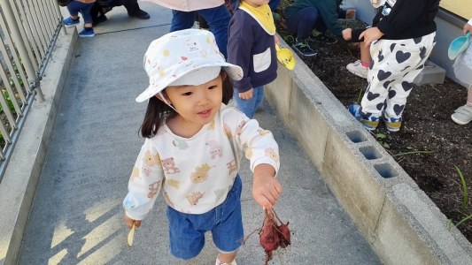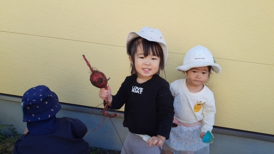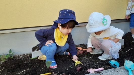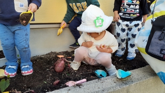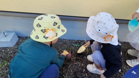 子どもたちも嬉しそうに「あった!あった!」と伝えてくれる姿に、また一段とさつまいもを掘る意欲が高まっていました。さつまいもを収穫すると「とれた~!」と喜びの声が!小さいさつまいもが収穫できると「あかちゃんみたいだね」という声もあり、子どもたちの発想には日々驚かされています。