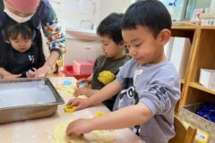 2歳児さんで型抜きクッキー作りをしました!エプロンと三角巾、マスクをつけた保育者…
