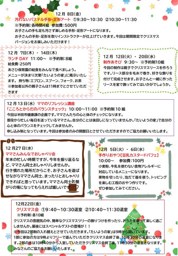 今年も残すところ、あと一か月となりました。師走ということで何かと気ぜわしくなり、なかなかお子さんとゆったりとした時間を過ごせてないのではないでしょうか。「たいようの家」に来て他のママさんや職員とお話したり、この時期ならではのイベントに参加するなど、お子さんと向き合う時間を作ってみてはいかがですか。「たいようの家」12月の予定表と地域サポートたより「えがお」の予定表です。皆さんのお越しをお待ちしています。