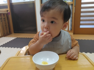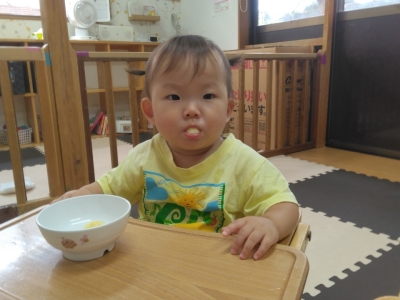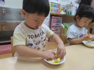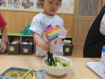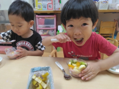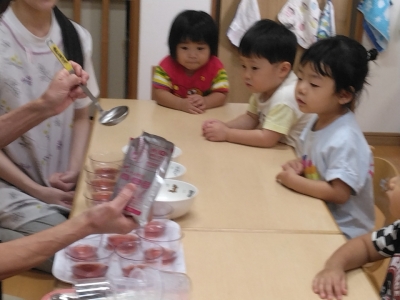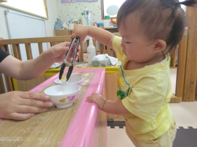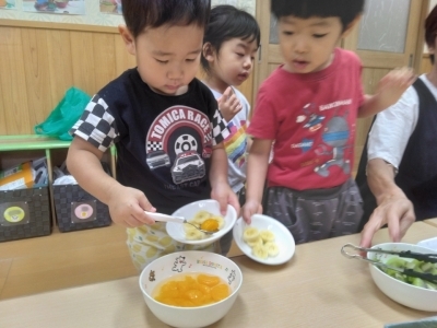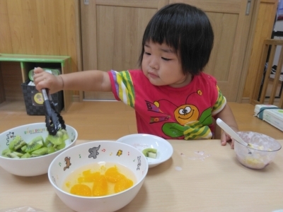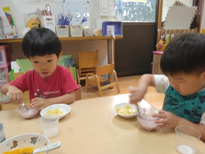 先生が作り方を伝えると、「たべた~い~!」「まぜまぜした~い!」「いっぱいバナナいれる~!」などいろいろな声が聞こえ、ワクワクしながら作り始めました。牛乳を入れてまぜまぜっ~。フルーチェができたら、果物をトングではさんで上にのせて出来上がり!0歳児のお友だちもトングでバナナをはさんでみました。「いただきま~す!」おいしいおやつのできあがり!