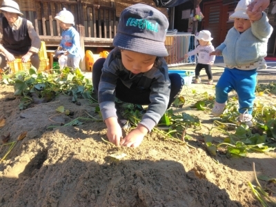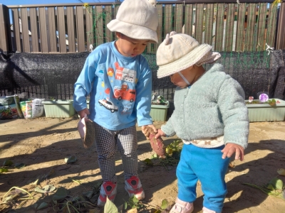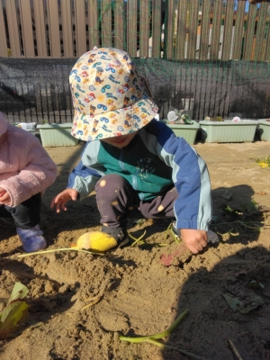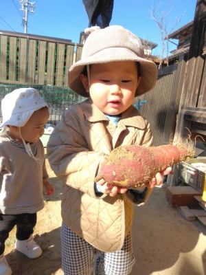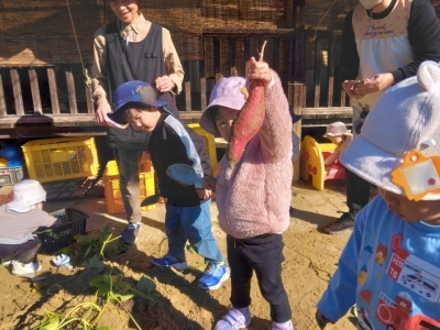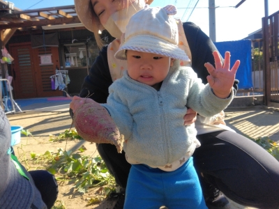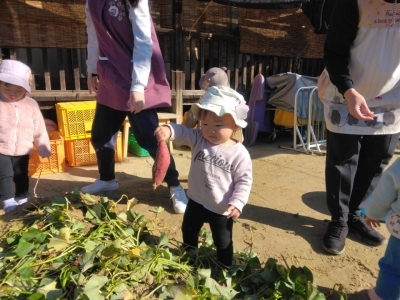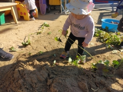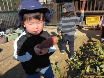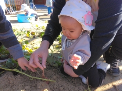 当日、2歳児は昨年の経験もあり、土の中から顔を出しているおいもを見つけると「おいもみつけた~!!」「あった~!!」と大騒ぎ!がむしゃらに掘り始めました。「どこだ、どこだ?」といろんな所を掘ってみたり、自分で掘ったおいもを大事そうに持ち歩いていたりしていました。
