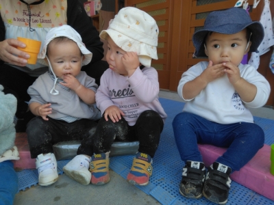 さて、実食の時間。みんな座ってむしゃむしゃおいしそうに食べていました。0歳児のお友だちも「(おかわり~!)」と口いっぱいにほおばっていました。