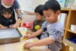 2歳児さんで型抜きクッキー作りをしました!エプロンと三角巾、マスクをつけた保育者が2歳児のクラスに入ると…嬉しそうな顔で自ら椅子に座り、やる気満々の2歳児さん。…